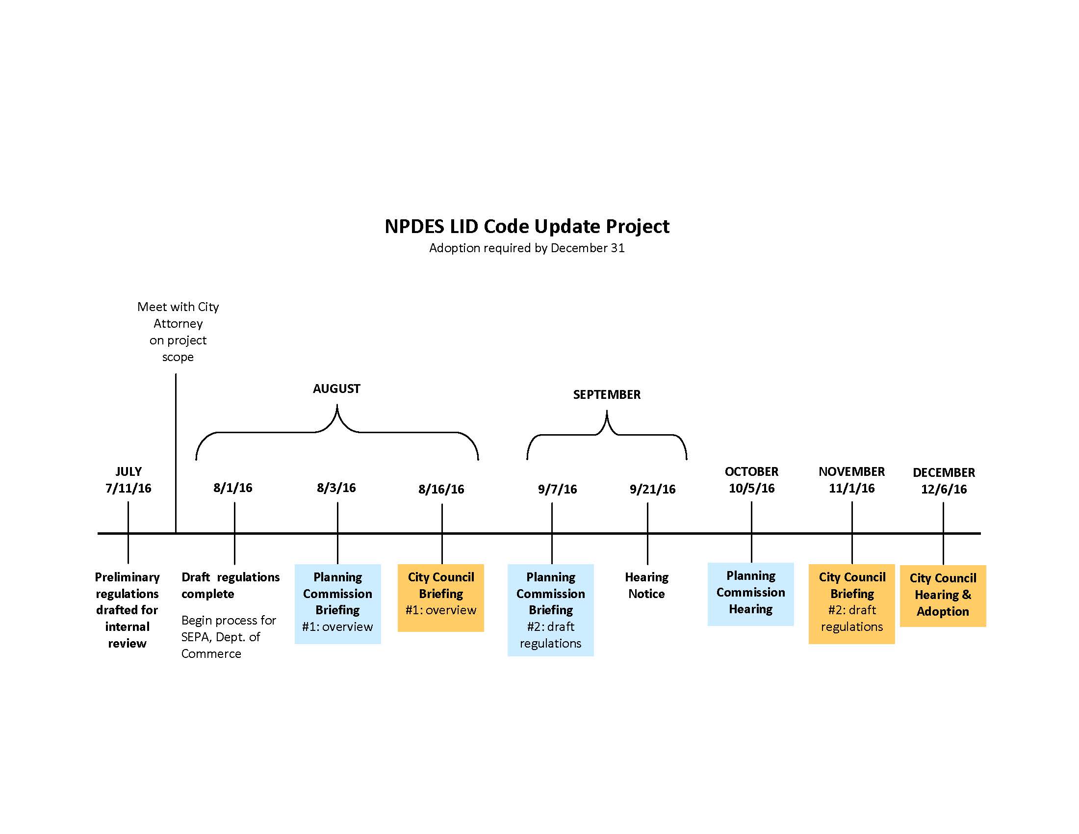 The new Manual and all associated code amendments must be adopted by the City Council by the end of 2016. City staff has been working on this project for several months, first identifying barriers in the existing regulations, then drafting revisions and new language. The proposed code revisions are complete, and the project is ready for public review and discussion. The Planning Commission and City Council will both hold two separate discussions on this item prior to the public hearings later this fall. The tentative schedule for all public meetings is shown in the image below.